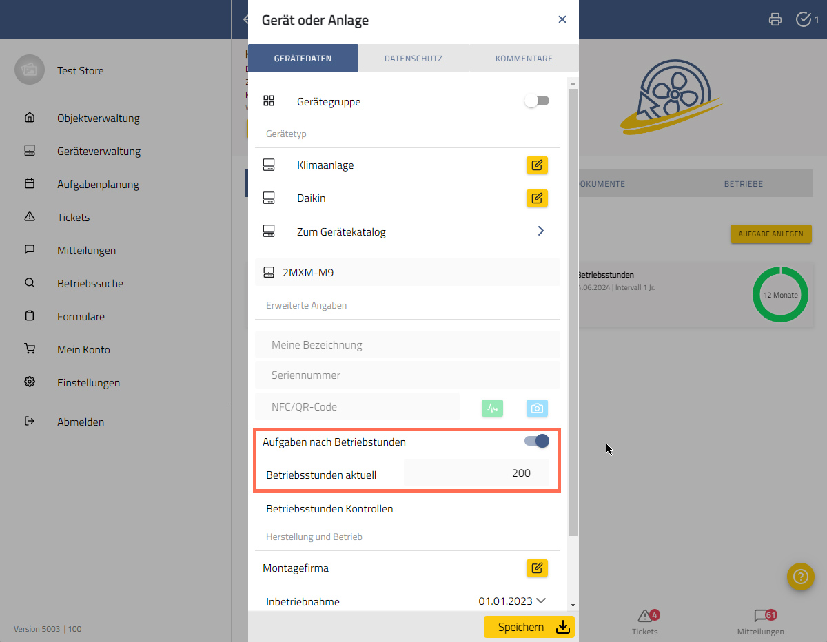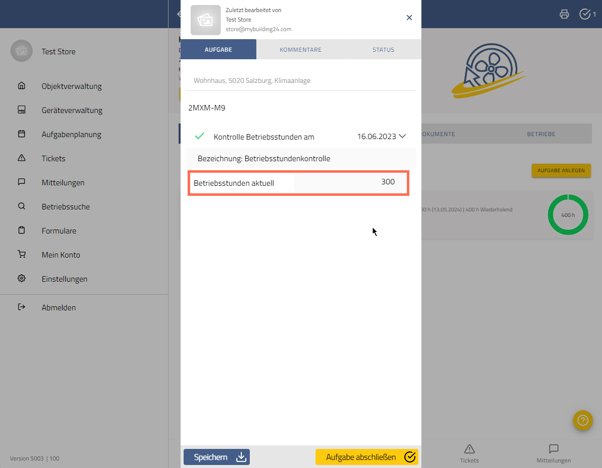- Geben Sie unter „Betriebsstunden aktuell“ den aktuellen Stand der Betriebsstunden des Gerätes ein.