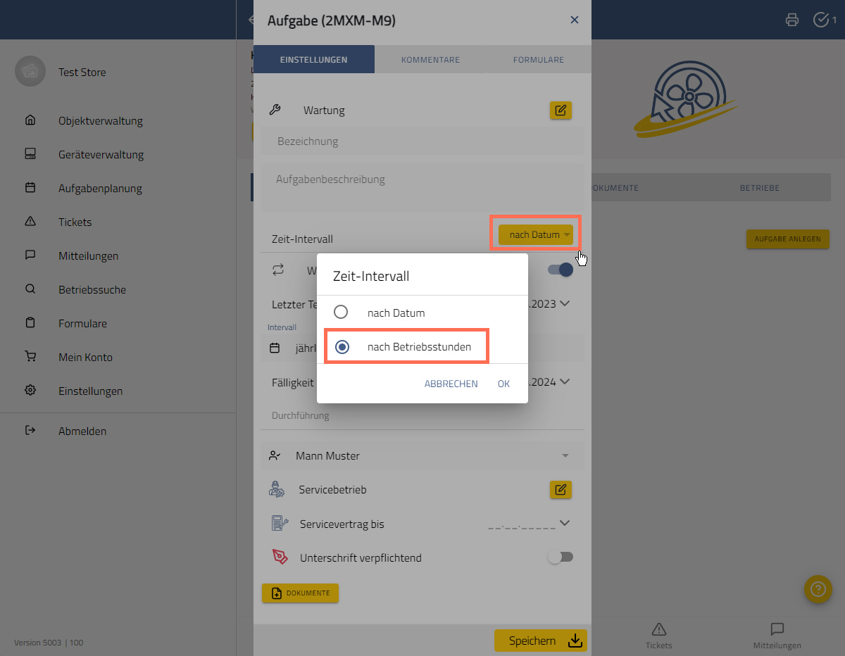 Um für ein Gerät Aufgaben nach Betriebsstunden vorzusehen, wechseln Sie in die Einzelansicht des Gerätes, anschließend: