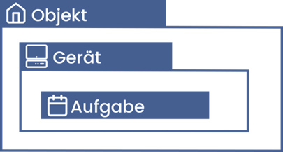 Auf der obersten Ebene finden sich Objekte. Diese können Gebäude, wie z. B. Ihr Büro sein. Innerhalb des Objektes, lassen sich Geräte erstellen, für welche Sie wiederum Aufgaben erstellen können, um deren Wartungsbedürfnisse abzubilden.