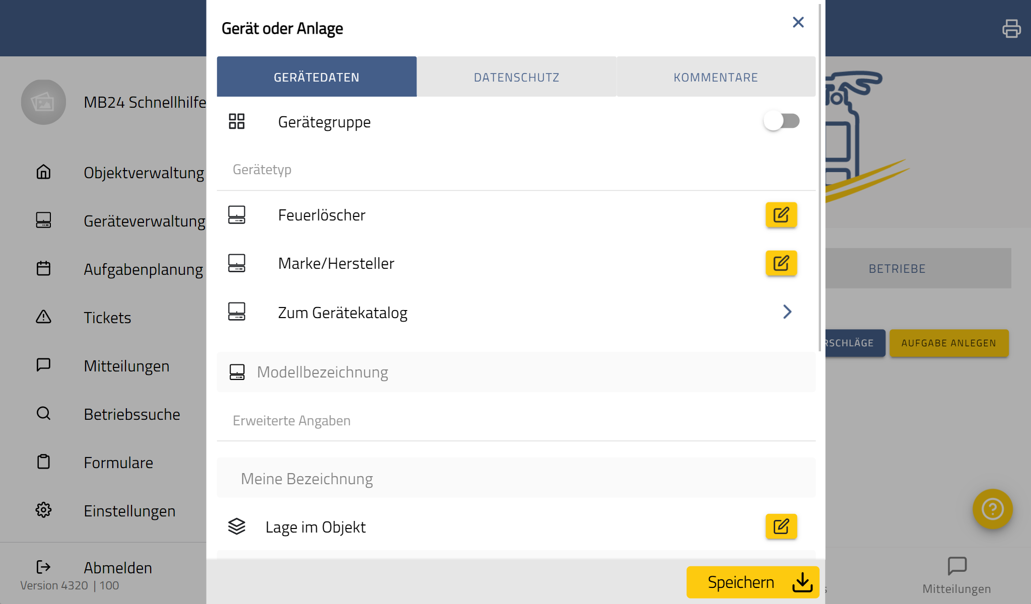 Sie lernen, wie Sie ein Objekt (z. B. Büro-Gebäude) erstellen. Wie Sie ein dort befindliches Gerät (z. B. Feuerlöscher) erstellen, und wie Sie dem Gerät eine Aufgabe hinzufügen.