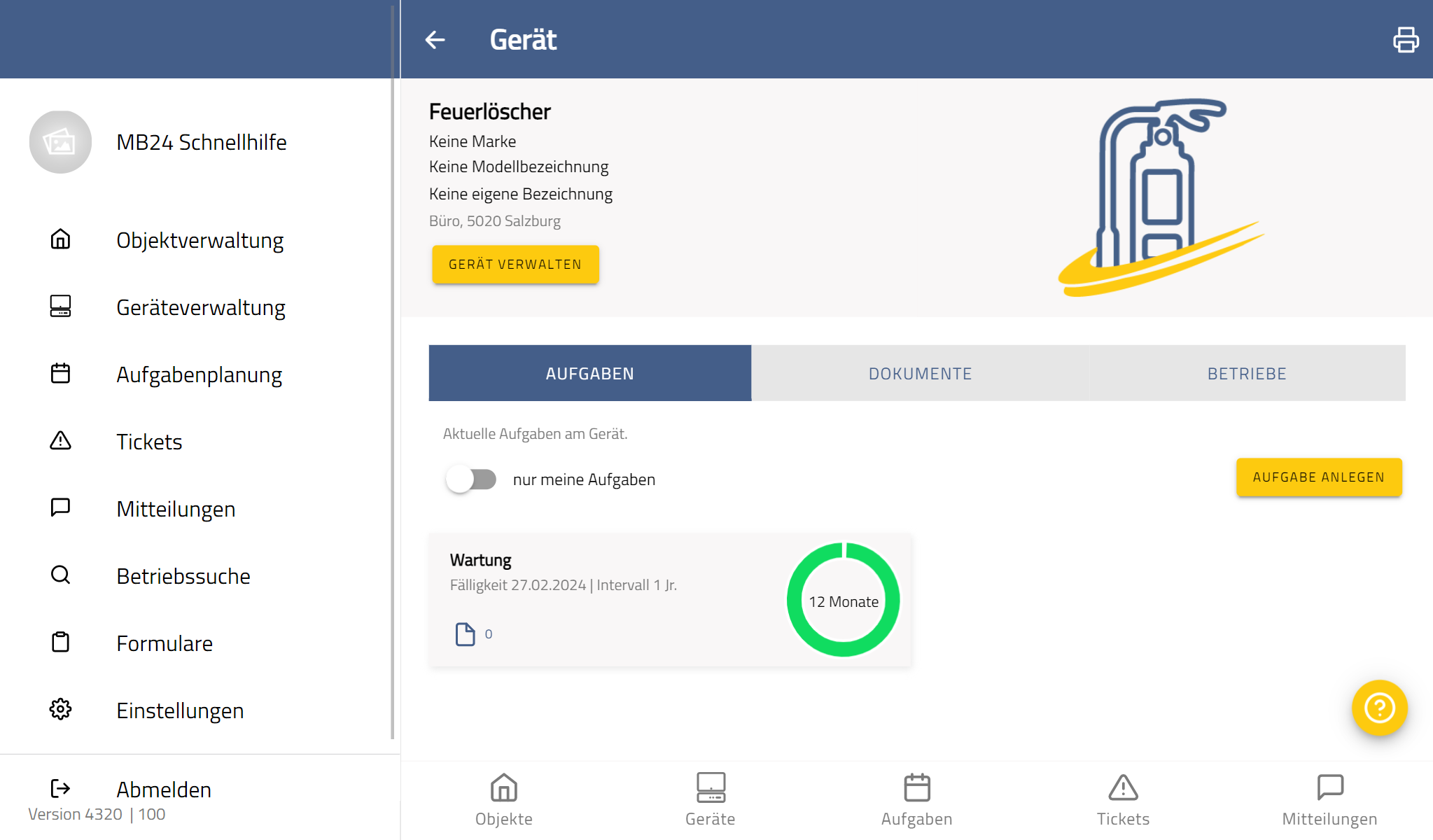 Sie haben den ersten großen Schritt in Richtung bessere Wartung getan. MyBuilding24 erinnert Sie fortlaufend an die angelegte Aufgabe für das Gerät “Feuerlöscher” im Objekt “Büro”.