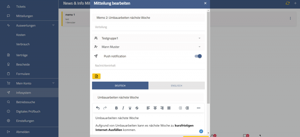 ob die Adressaten via Push-Nachricht informiert werden sollen. - Geben Sie Ihren entsprechenden Betreff und Text ein, und bestätigen Sie via Klick auf die