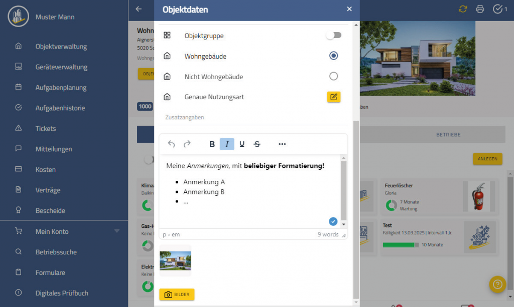 - Unter Zusatzangaben finden Sie nun das überarbeitete Notiz-Feld, das diverse Formatierungen