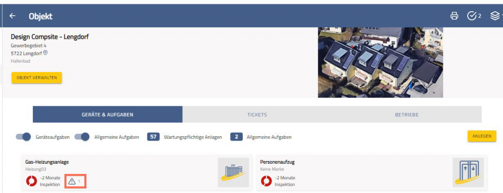 In der Einzelansicht eines Objektes/Gerätes (Reiter „Geräte & Aufgaben“ bzw. „Aufgaben“) werden Aufgaben bzw. Geräte für die Tickets existieren, mit dem entsprechenden Ticket-Icon versehen.
